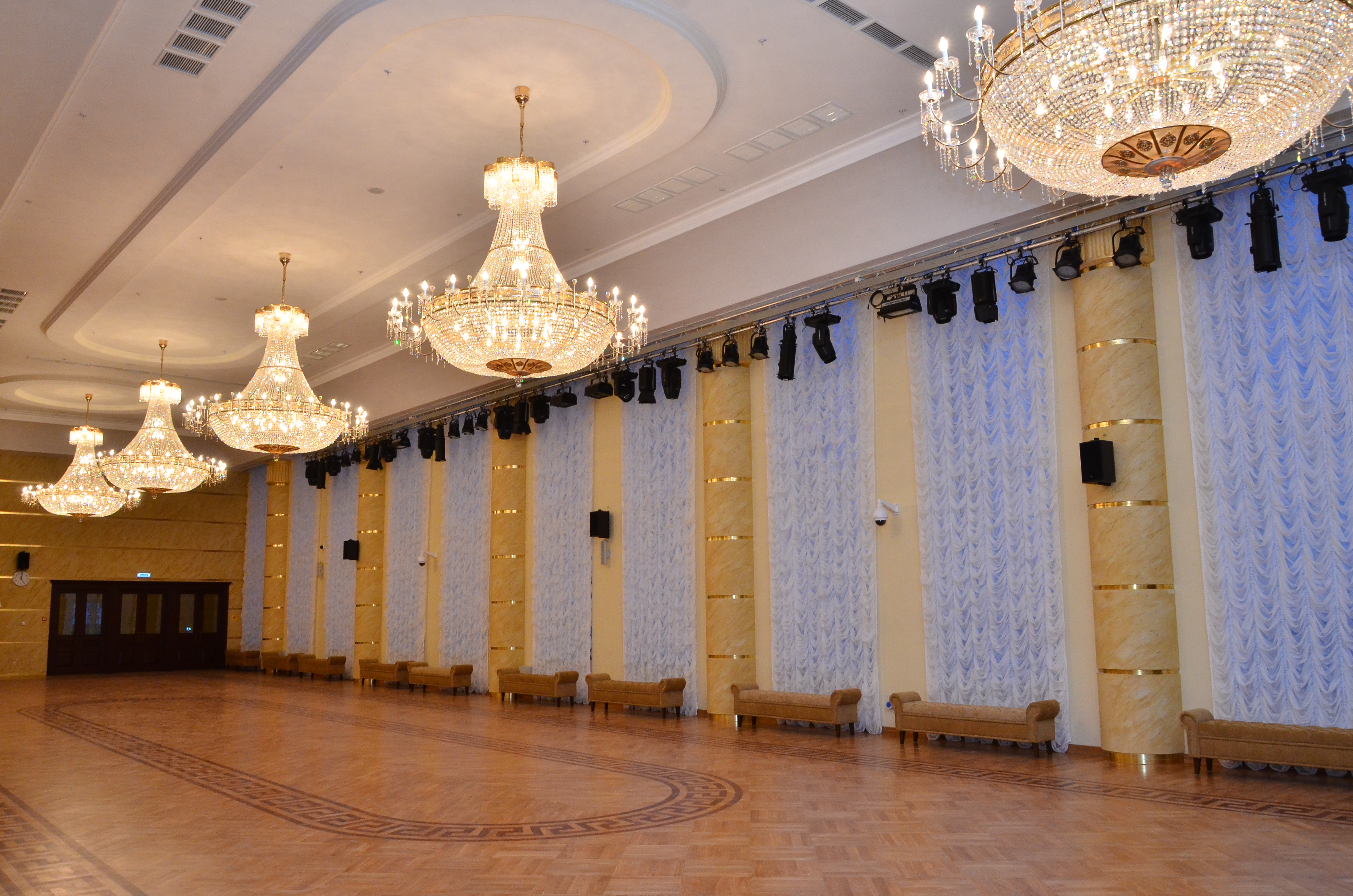 Танцевальный зал — это танцевальный паркет площадью 400 кв. метров! Зеркала вдоль стен и красивые люстры.